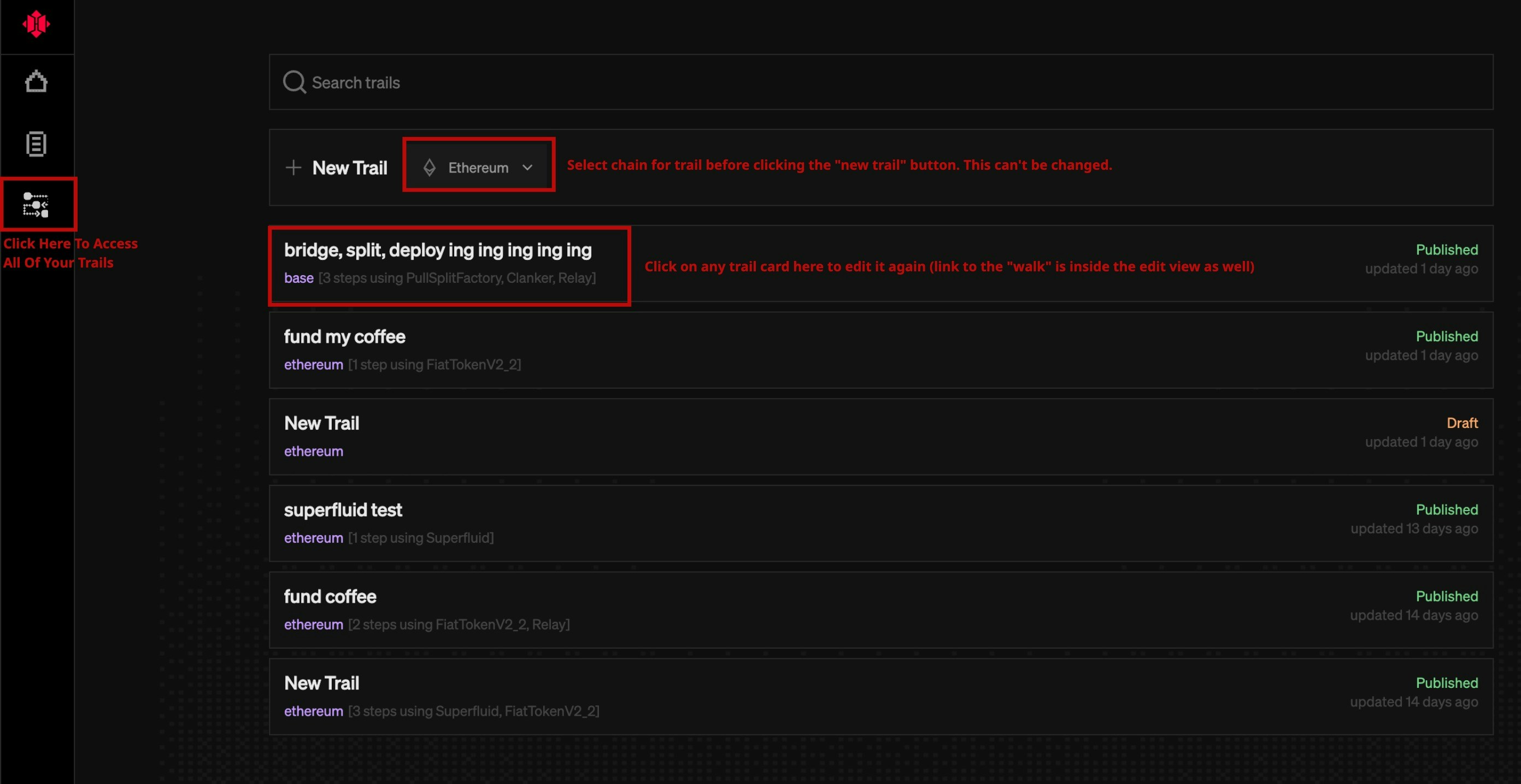 To get started, you’ll have to sign up for a Herd account. Then, you click the “Trails” button on the sidebar. You may then proceed to create a new trail on Base or Ethereum.
