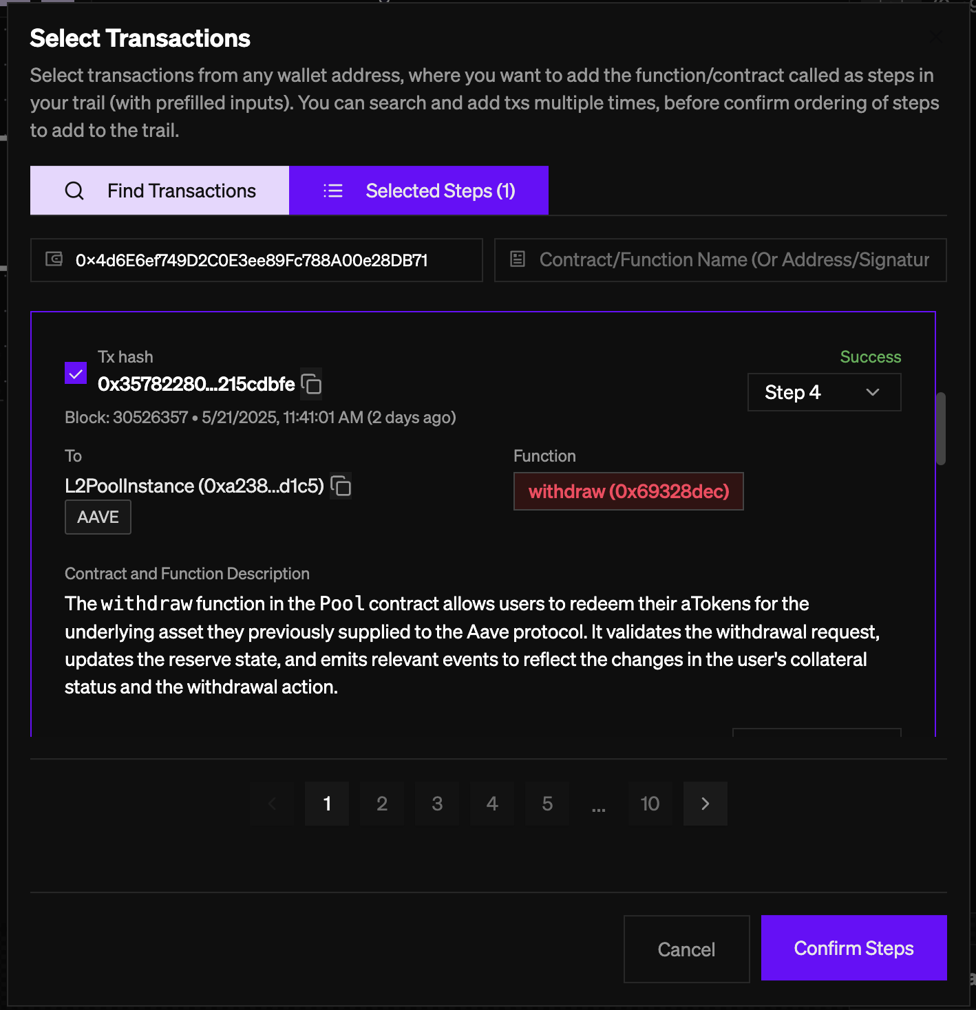 The easiest way to add new trail nodes is in bulk from any wallet’s transactions. From the “Add Step” node, click “From Transactions → Search and Add Transactions” to get the view below. This allows you to reference past transactions for any wallet and select/order multiple directly: